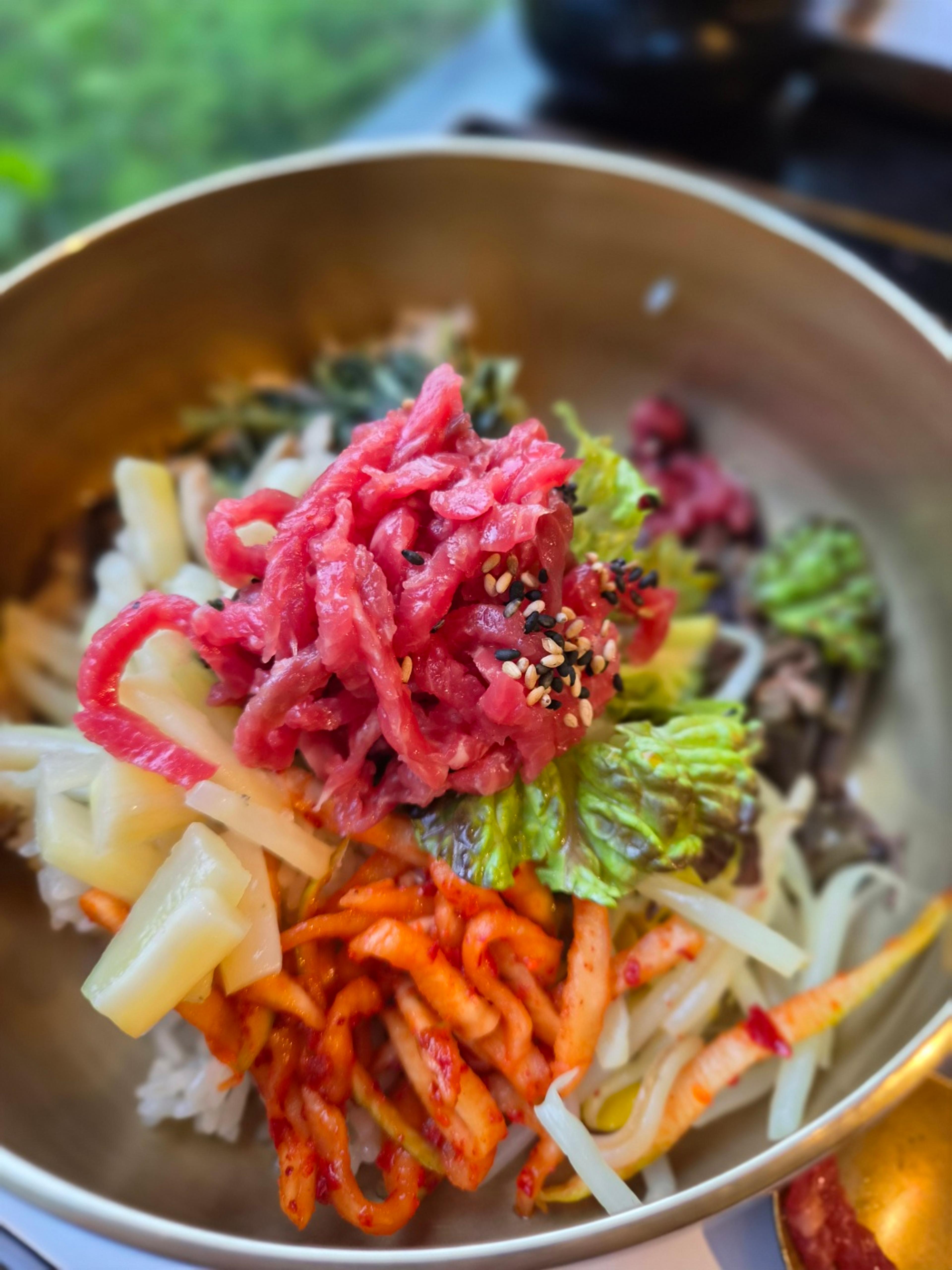 One of the highlight menu items is the Yukhoe (Beef Tartare) Bibimbap. It features high-grade, fresh raw beef seasoned lightly to highlight its natural sweetness, paired with house-made gochujang and fermented jang.