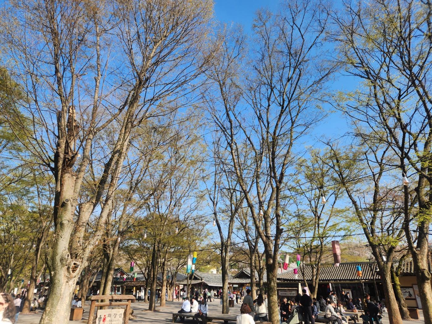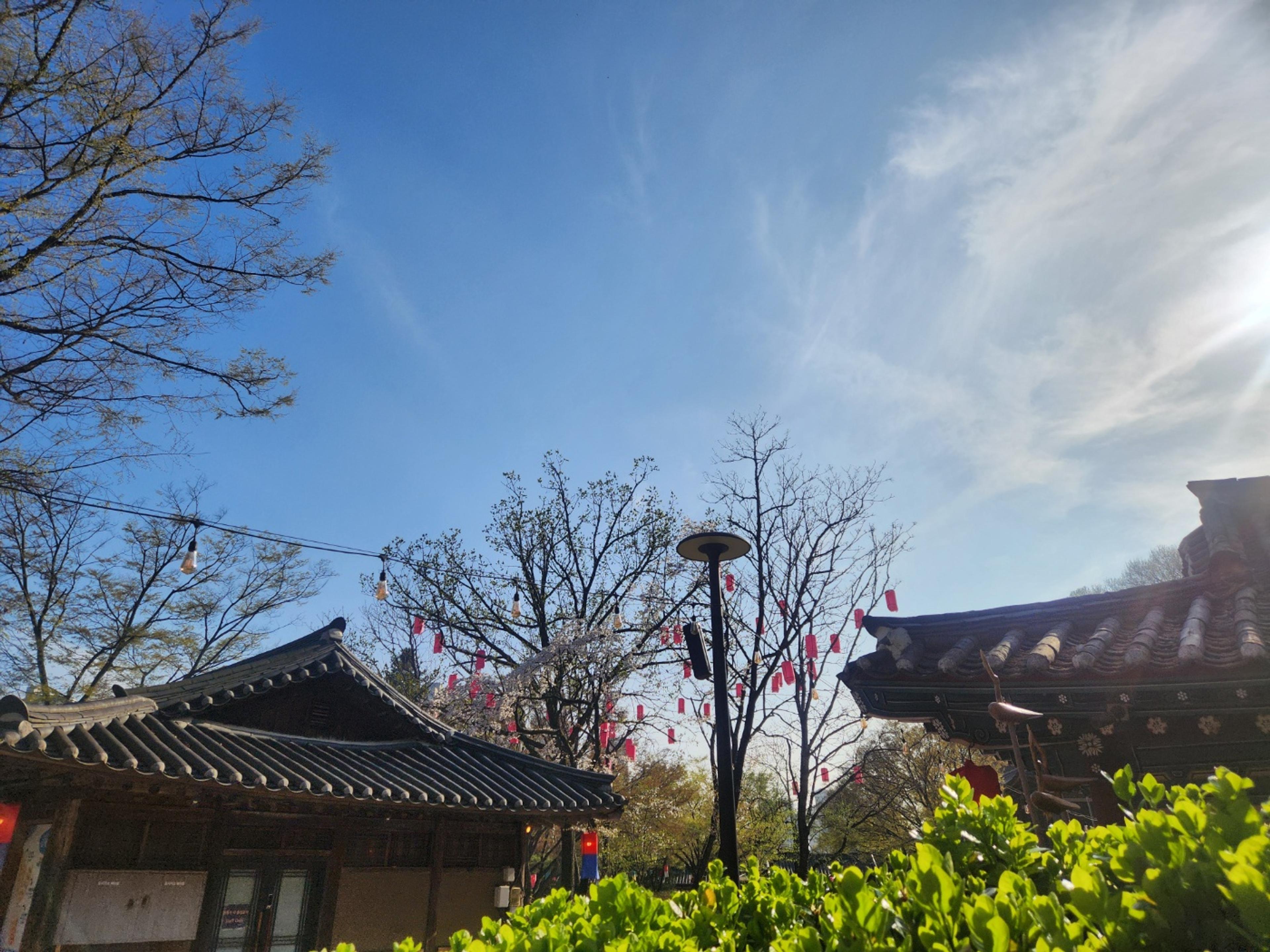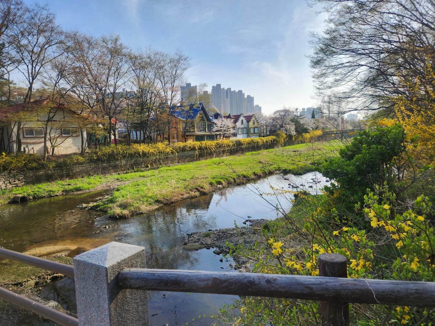 Right as you walk past the entrance, you’re greeted by a beautiful stream lined with blooming yellow forsythias and cherry blossoms. But here’s my favorite part: if you look closely, you can see traditional thatched-roof houses with modern apartment complexes peeking out right behind them. Isn’t it fascinating? That mix of deep history and modern city life in one single frame is exactly what makes living in Korea so unique.