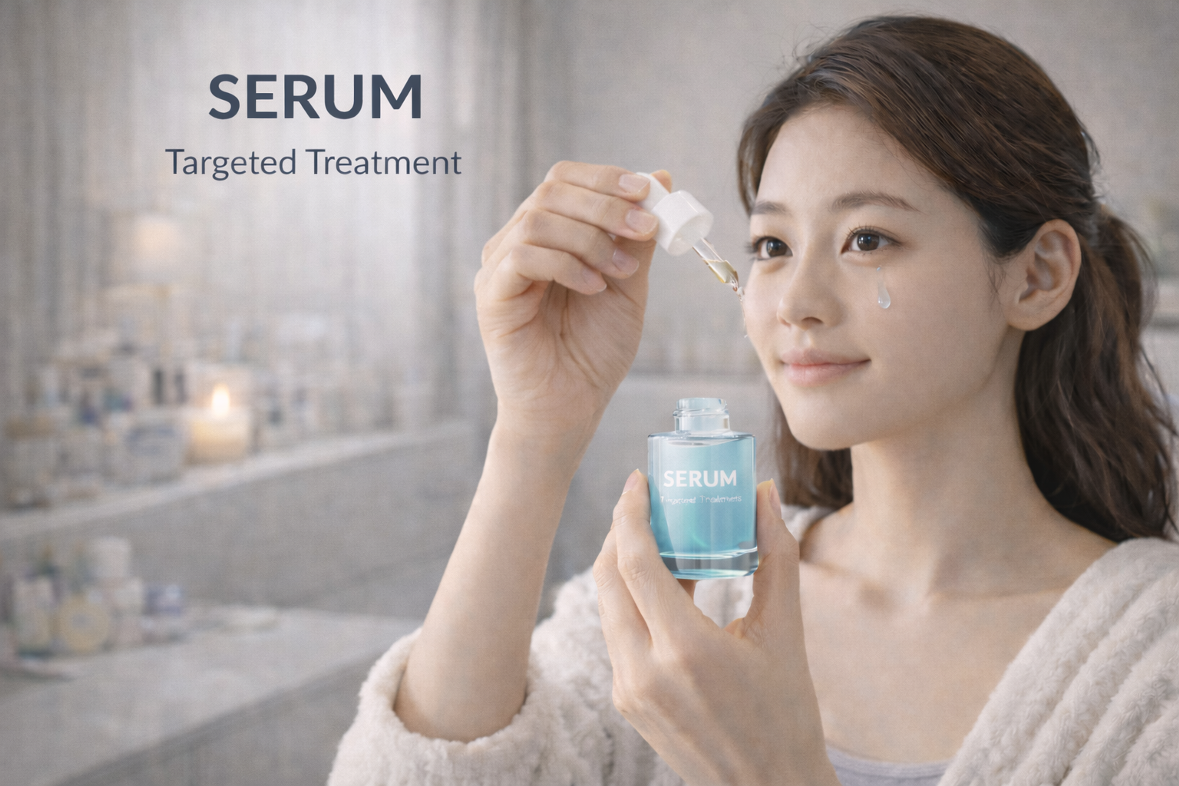 A serum is more targeted. Higher in active ingredient concentration than an essence, it is designed to address a specific skin concern — hyperpigmentation, fine lines, dullness, or sensitivity. Where an essence works broadly, a serum works precisely. You choose a serum based on what your skin needs most, and you apply it after the essence so it lands on skin that is already primed to receive it.